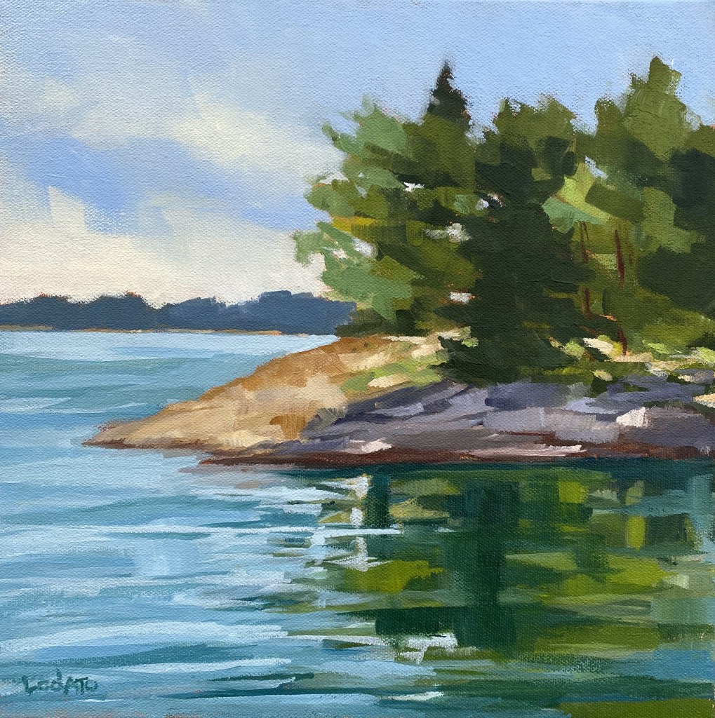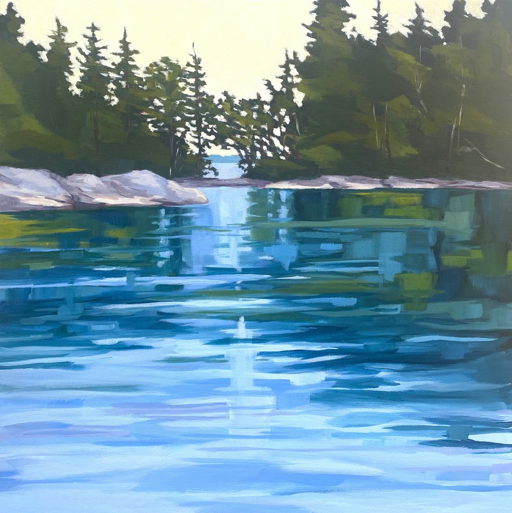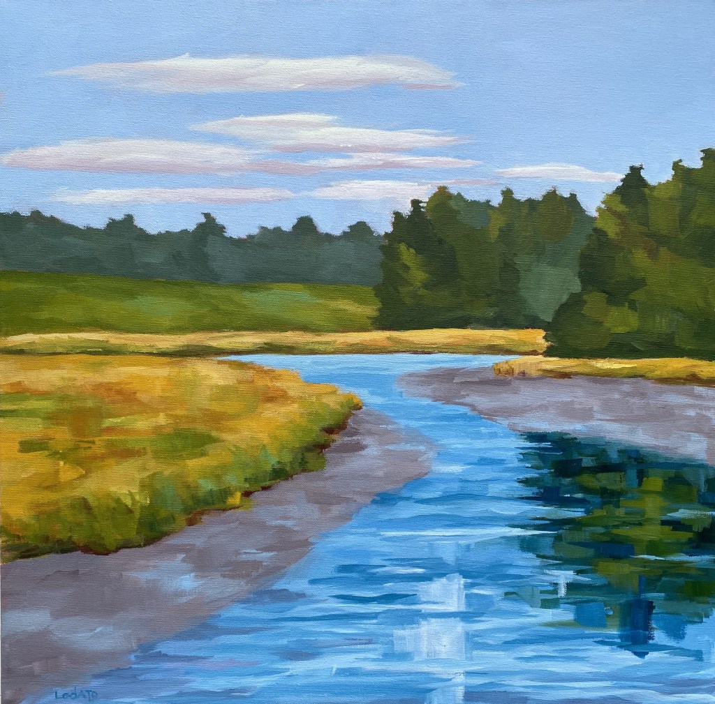 Stacey’s paintings are deeply influenced by Maine’s saltwater marshes, landscapes, and seascapes. She enjoys exploring how objects interact to define shapes, light, color, and patterns. Working with a traditional palette of warm and cool colors, Stacey pays careful attention to values, aiming to create richness and visual interest in her pieces.